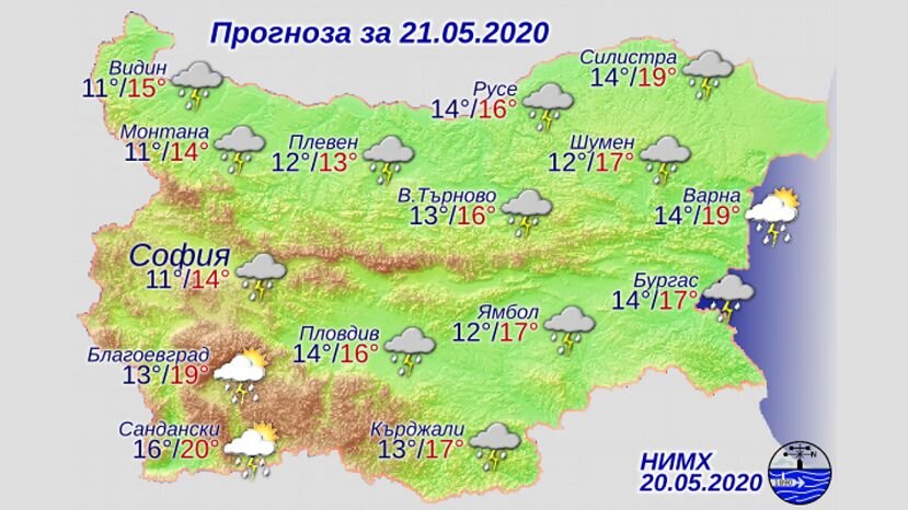 Ночью будет облачно, в северо-западной половине страны с дождем. Днем дожди охватят всю страну, в юго-восточной половине возможны грозы и град. После обеда с северо-запада осадки начнут прекращаться. Максимальная температура будет между 14° и 19°... Прогноз погоды в Болгарии на 21 мая