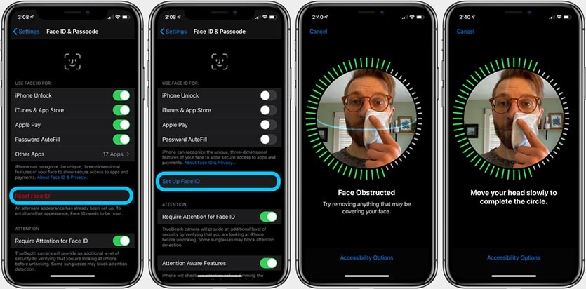 Во время пандемии коронавируса многие люди большую часть дня находятся в защитных масках. В таком виде довольно неудобно использовать iPhone с Face ID. Распознавшие лица не будет срабатывать, для разблокировки придется снимать маску или вводить код разблокировки. Есть способ научить систему распознавать лицо прикрытое защитной маской. Как настроить Face ID в маске 1. Перейдите в Настройки – Face ID и код-пароль. 2. Сбросить Face ID, а затем нажмите Настройка Face ID, чтобы произвести настройку заново. 3. Сложите маску пополам и приложите ее к одной половине лица. Чтобы Face ID распознал лицо, желательно не перекрывать более половины носа и рта. Если увидите сообщение, что лицо не обнаружено, сдвигайте маску, освобождая большую часть носа и рта. 4. Произведите сканирование лица наполовину прикрытого маской. 5. Когда сканирование будет завершено, нажмите Альтернативный внешний вид. 6. Приложите сложенную маску к противоположной стороне лица и повторите процедуру сканирования. 7. Когда