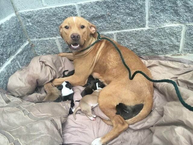 Когда сотрудники приюта возвращались на работу после выходных, на заднем дворе их ожидала самка пит бультерьера и ее потомство-новорожденные малыши. Всего на свет появилось десять щенков. Работники приюта недоумевали, как можно было бросить животное да еще и со щенками, без еды и воды, зная, что приют в выходные не работает? Ведь этот человек, если его можно так назвать, не предупредил, заранее не позвонил. Собака была без поводка, а значит в любой момент могла бы уйти. Но нет, какая мать может оставить своих детей? И она голодая и испытывая жажду на протяжении двух суток оберегала своих малышей, лишь тихонько поскуливала моля о помощи. Невзирая на всеобщую известность о бойцовском нраве собак породы питбультерьер, самка оказалась абсолютно добрым и послушным животным. Несмотря на то, что ее недавно предали, собака позволила приблизиться сотрудникам приюта к ней и ее щенкам, разрешила погладить малышей и взять их на руки для проведения осмотра. Животное позволило также осмотреть себя.