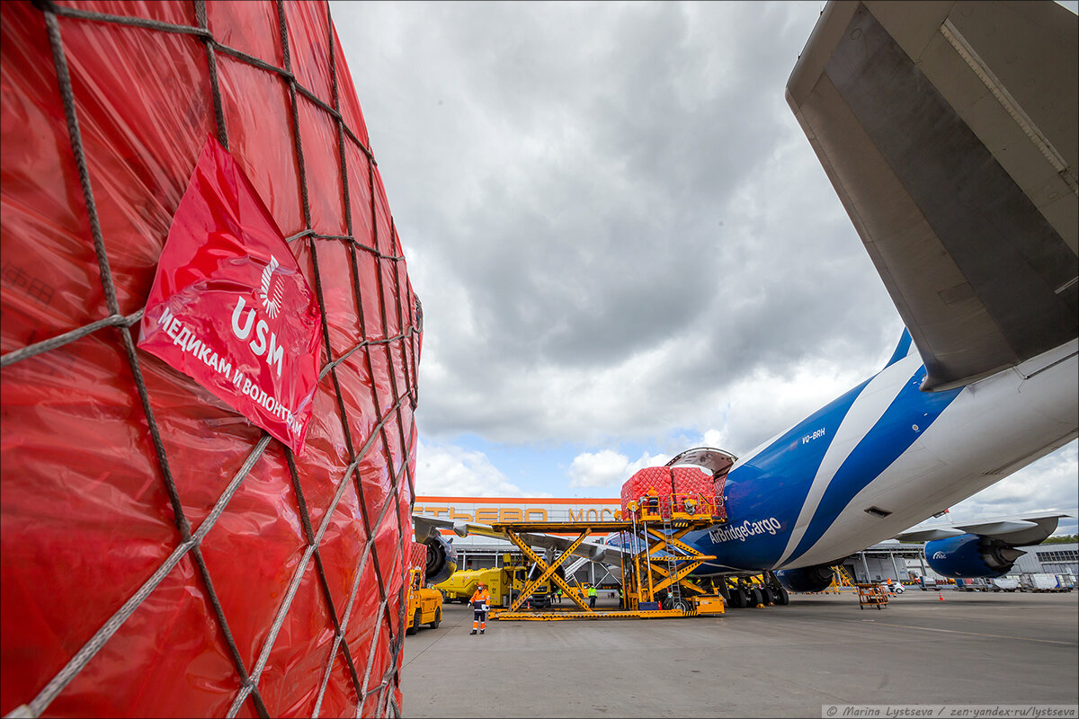 Вчера с группой корреспондентов встретили в Шереметьево рейс, который привёз разные средства защиты для российских медиков и волонтеров. Боинг-747 авиакомпании «ЭйрБриджКарго» Рейс интересен тем, что спонсором выступил российский холдинг USM Алишера Усманова. Я в последнее время встречаю много комментариев о том, что, мол, в другие страны мы постоянно что-то отправляем, а своим врачам не хватает средств защиты. Вот и ответ от миллиардера – одноразовые защитные маски, комбинезоны, нитриловые перчатки, очки, бахилы. При этом часть средств индивидуальной защиты была приобретена у отечественных производителей. В ближайшее время груз безвозмездно передадут на нужды Оперштаба по борьбе с коронавирусом в РФ. Всего же в период с 28 апреля USM обеспечил поставки более 30 млн. средств индивидуальной защиты для нужд российских медработников и волонтеров. Объем закупленного инвентаря - более 350 тонн. Вчерашняя завершающая крупная поставка весом 125 тонн (маски и комбинезоны) произведена