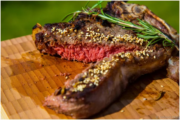 На фотографии — имбирный стейк портерхаус, вкус которого очень сильно изменился, благодаря применению одной простой и совершенной по своей универсальности приправы — соли сезам.