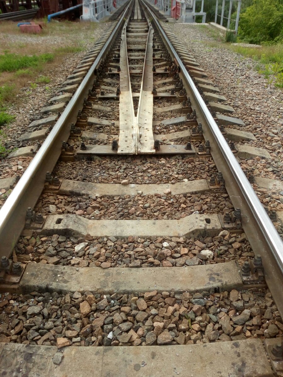 Недавно переходя через железнодорожные пути наткнулся на интересную конструкцию. Так как я человек далекий от всей этой темы, сначала подумал, что это обычная стрелка. Эта мысль не задержалась в голове дольше секунды. Какая же это стрелка, если путь один, да и конструкция сходится в центре, не прилегая к самим рельсам. Позже выяснилось, что это так называемый контррельс также именуемый, как охранный рельс или контруголок. Его устанавливают на стрелочных переводах, крутых кривых и мостах. В конкретном случае контррельс установлен на железнодорожном мосту. Контррельсы, установленные на мостах, предназначены для удержания вагона в пределах пути при сходе тележки с рельс. Если мост не будет оборудован контррельсом, то сошедший вагон может развернуть, и он попросту повредит конструкцию моста или вовсе свалится с него. Для того чтобы волочащиеся детали подвижного состава не зацепились за начало контруголков, их концы загибают, скашивают под углом 45 градусов или прикрепляют к середине шпа