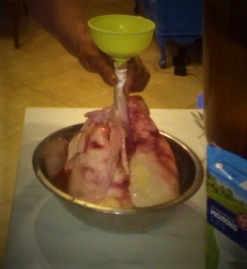 Никогда бы не подумала, что из бараньих легких может получится сыр! Рецепт был подсмотрен у узбеков, которые работают строителями в неподалеку. Баранина излюбленное мясо для этого и других народов средней Азии. Традиционно - это блюдо подают на свадебный стол, но оно может быть приготовлено и просто к завтраку. Для приготовления блюда нам необходимы ЦЕЛЫЕ, неповрежденные легкие барана с горловиной. Около 3-4 литров молока, пачка сливочного масла- 200 грамм, соль, удобнее приготовлять вдвоем. 1. Легкое промыть в холодной воде и надуть через горловину, чтобы легкое растянулось, несколько раз залить в легкое воду и слить, это следует до тех пор пока легкое не станет белым. 2. Далее вставляем в горловину воронку, и вливаем теплое, не горячее молоко около литра, затем вливаем молоко (1 литр) предварительно смешенное с растопленным сливочным маслом и вливаем еще теплое молоко, сколько влезет. Таким образ