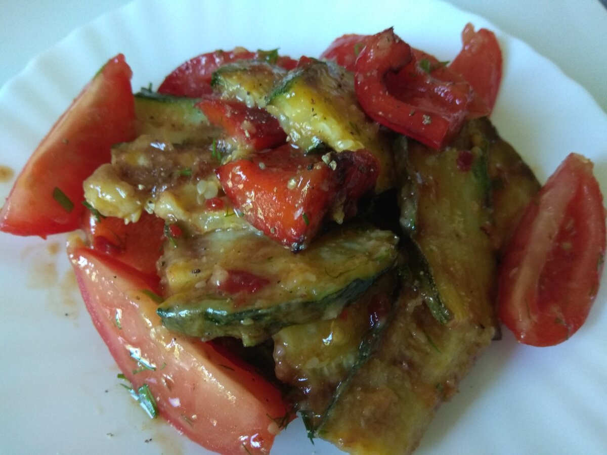 Если не знаете ,что ещё приготовить из кабачков, сделайте этот салат. 🥗 Для него понадобится готовая салатная заправка Тайская, продается в Магните. Кабачки 2 шт Перец красный болгарский 0.5 шт Помидоры 2-3 шт Чеснок 1 зубчик Укроп или кинза Масло растительное 3 ст.л Мука Кабачки порежьте пластинками, обваляйте в муке и обжарьте на разогретом масле. Положите жареные кабачки на салфетку, дайте стечь маслу. Болгарский перец порежьте дольками и тоже обжарьте. Помидоры нарежьте дольками. Обжаренные полоски кабачков порежьте на 3-4 части, положите в салатник, добавьте перец, помидоры, измельчённый чеснок и зелень. Полейте салатной заправкой и перемешайте. Приятного аппетита!