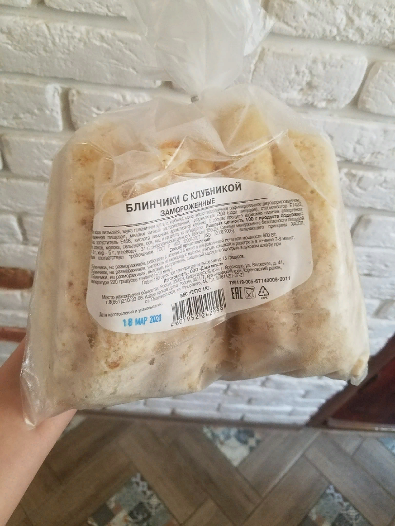 Решилась попробовать полуфабрикаты из магазина Светофор. Выбор пал на блинчики с клубникой за 81 рубль килограмм (были и другие фруктовые начинки, и даже мясные, но блинчики с мясом а такую цену я бы точно взять не решилась). Блинчики с клубникой выглядели очень привлекательно и аппетитно, а также не были переморожены. Сегодня расскажу стоит ли брать подобный продукт в магазине Светофор. Полуфабрикат упакован в плотный пакет. Блинчиков внутри много. Они небольшого размера, вытянутой формы. Состав, в принципе, сносный. Ничего особенно пугающего в нём нет, при этом в составе указана натуральная клубника, а не клубничный джем, что даже плюс. Зато вместо цельных яиц в блинчиках яичный меланж, что, конечно, минус. Калорийность продукта 180 ккл на 100 грамм. Согласно инструкции на упаковке, блинчики можно приготовить тремя способами: Я решила блинчики всё-таки пожарить на сковороде. Блинчики быстро приготовились. Я обжарила их с каждой стороны до золотистой корочки, а потом накрыла крышкой
