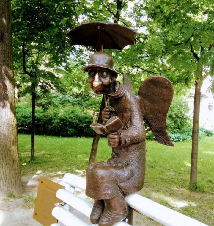 Маленькая фигурка, расположилась на скамейке в симпатичном саду. Памятник не является ангелом, в привычном для нас понимании этого слова. Его автор - петербургский мастер кукол, Роман Шустров, говорит что его «ангел» — это памятник посвящённый старикам, пережившим все тяготы первой половины XX века и сумевшим сохранить свой оптимизм и живой интерес к людям.