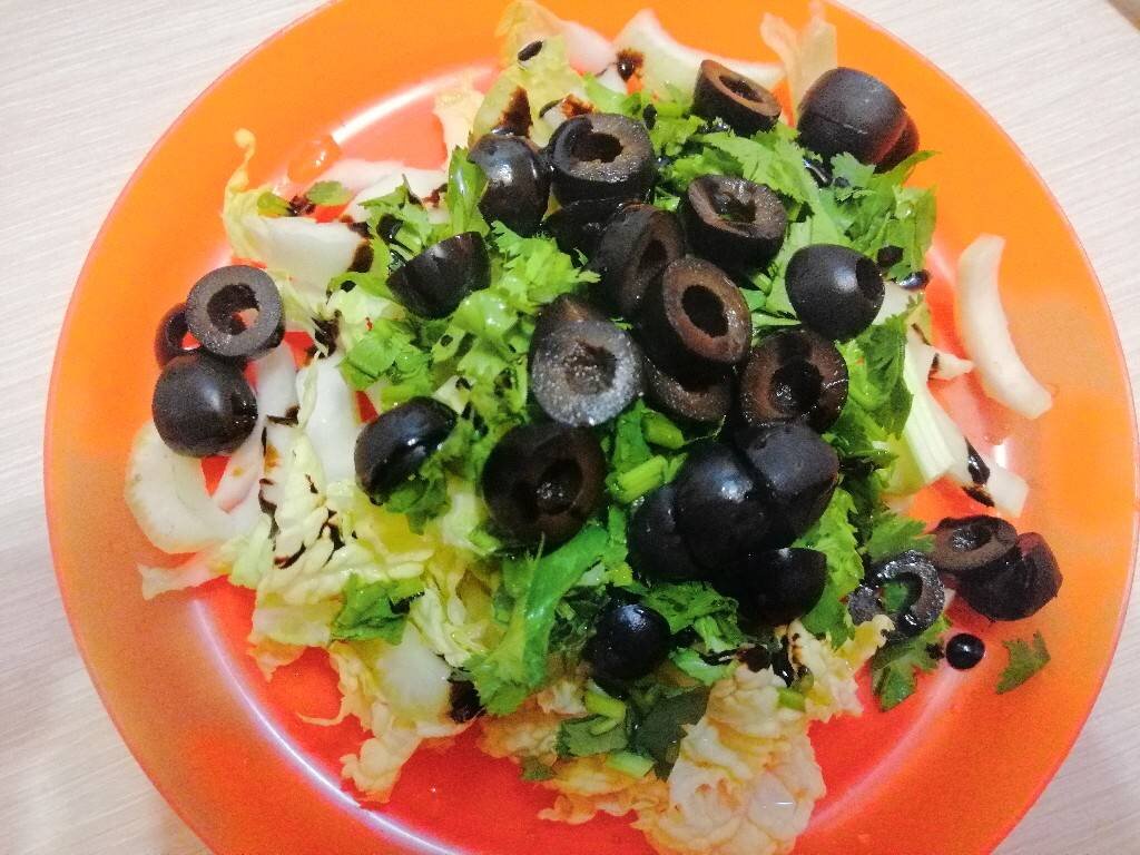 - Все ингредиенты нарезать не очень крупно. Полить маслом, добавить зелень. Я немного добавила уксус бальзамический. Можно поэкспериментировать и добавить тунец, консервированную кукурузу.
