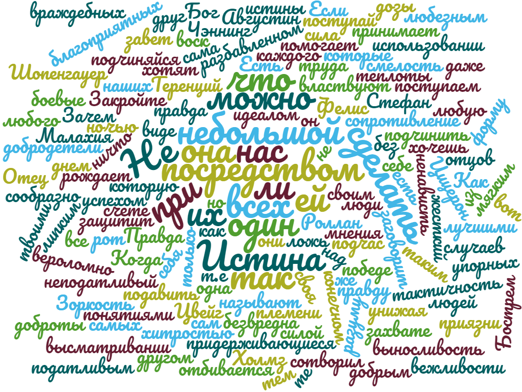 Не один ли у всех нас Отец? Не один ли Бог сотворил нас? Зачем же вероломно поступаем друг с другом, унижая тем завет отцов наших? (Малахия) Если хочешь подчинить себе все, сам подчиняйся разуму, т.е. поступай сообразно с твоими лучшими понятиями. (Бострем) Как жесткий и неподатливый воск посредством небольшой теплоты можно сделать таким мягким и липким, что он принимает любую форму, так любого из самых упорных и враждебных людей посредством небольшой дозы вежливости, доброты и приязни можно сделать податливым, любезным и даже добрым. (Шопенгауер) Зоркость в высматривании благоприятных случаев; смелость и тактичность при их захвате; сила и выносливость при их использовании - вот те боевые добродетели, которые властвуют над успехом. (Августин Фелис) Правда подчас рождает ненависть. (Теренций) Истина у всех одна, но у каждого племени есть своя ложь, которую они называют своим идеалом. (Роллан) Есть люди, придерживающиеся мнения, что правда безвредна только в разбавленном виде. (Холмз) Ко
