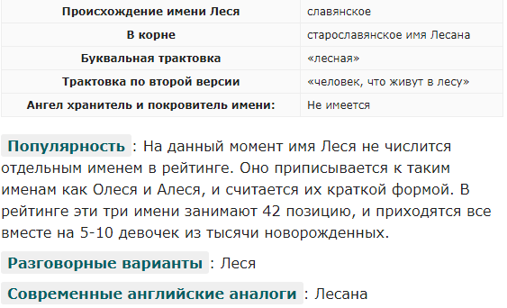 Женское имя Леся имеет славянское происхождение. Вероятнее всего, происходит от имени древних славян «Лесана», образованного от старославянского слова «лес». Имеет трактовку «лесная» или же «живущая в лесу». Больше всего пользуется популярностью на Западной Украине, хотя встречается и в РФ. Происхождение, энергетика и значение имени наделяют носительниц уникальным набором положительных характеристик. Обычно Леся, это искренняя и веселая, добрая и оптимистичная, доброжелательная и позитивная, коммуникабельная и красноречивая, скромная и немного стеснительная девушка. СМОТРИТЕ ВИДЕО - ПОДРОБНЕЕ ТУТ Источник - Значение имени Леся: карма, характер и судьба