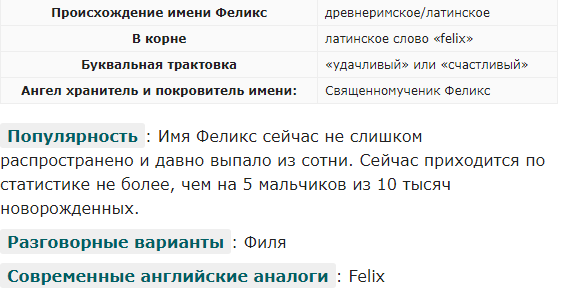 Мужское имя Феликс имеет древнеримские корни и считается латинским по происхождению. В основе – латинское слово «felix», что в переводе с латыни может трактоваться по-разному. Значение определяется как «благоприятный», «благополучный», «счастливый», «удачный». Набирает популярность в РФ. Обладает интересной значимостью и достаточно сильной энергетикой, что сулит носителю имени Феликс уникальный набор характеристик. Однако все Феликсы весьма противоречивые личности, в их характере присутствуют такие черты как самоуверенность и навязчивость, решительность и самодостаточность, эгоистичность, настойчивость и напористость, свободолюбие и настырность. СМОТРИТЕ ВИДЕО - ПОДРОБНЕЕ ТУТ Источник - Значение имени Феликс: карма, характер и судьба