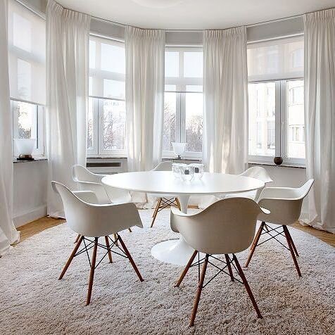 Не у всех площадь позволяет сделать полноценную столовую, в этом случае на помощь помогает эркерное пространство, которое не только воплотит вашу давнюю мечту в уютном и просторном обеденном месте, но и отвлечет внимание гостей от кухонного гарнитура. Если места не так много, то делать лавку как во втором примере я не рекомендую, так как она визуально съест пространство, а вот поставить в эркер круглый стол со стульями будет самым хорошим решением. Что бы усилить акцент на данной зоне, выберите стулья яркого цвета или сделайте их на контрасте с общим фоном, а так же используйте подвесную люстру над столом, это усилит эффект выделения. 2. Эркер в гостиной