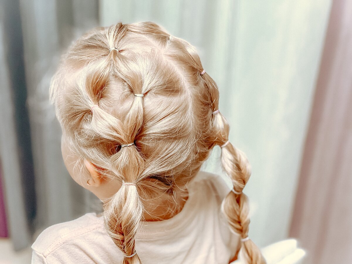 1. Собираем волосы в пучок и закрепляем резинкой. 2. Разделяем на две части, захватывая часть свободных волос и закрепляем резинкой. 3. С другой стороны повторяем. 4. Далее снова разделяем волосы на две части. 5. Добавляем часть свободных волос и закрепляем резинкой. 6. Далее повторяем. 7. Закрепляем хвост резинкой. 8. И делим на равные части с помощью резинок. 9. Выворачиваем хвост наизнанку. 10. С другой стороны делаем всё симметрично. Прическа готова! Видео других причесок смотрите на You Tube канале Прически для девочек