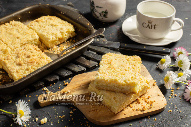 Ингредиенты: Для теста: - мука пшеничная – 200 г; - разрыхлитель – 1 ч. ложка; - масло сливочное – 150 г; - сахарный песок – 50 г; - ванильный сахар – 1 пакетик. Для начинки: - творог – 200 г; - сметана – 50 г; - яйцо – 2 шт.; - сахарный песок – 170 г; - лимон – 1 шт.; - крахмал или мука – 20 г. 🥛К жирному творогу добавляем сметану, перемешиваем 🍋Лимон моем, натираем на мелкой тёрке цедру, выжимаем сок. К творогу добавляем лимонный сок и цедру. Насыпаем сахарный песок 🥚Разбиваем яйца, всё перемешиваем. Добавляем крахмал (картофельный или кукурузный) или пшеничную муку 🧈Смешиваем в миске муку и разрыхлитель. Замороженное сливочное масло обваливаем в муке, натираем на крупной тёрке в муку 🥄Насыпаем сахар и ванильный сахар. Растираем муку с маслом и сахаром, пока не получится мелкая и рассыпчатая крошка 🔥Отделяем 2\3 крошки, высыпаем в небольшую прямоугольную форму. Нагреваем духовку до 180 градусов. Ставим форму на 10 минут в духовку ⏳Выливаем начинку в форму. Сверху посыпаем пирог