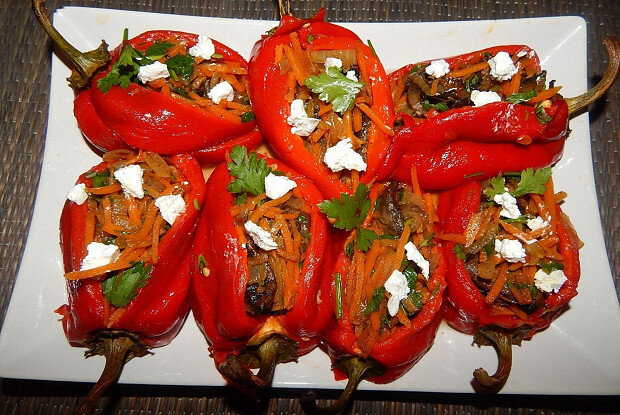 3. Лук и чеснок нарезать и обжарить в оставшемся масле, добавить натертую морковь, перемешать и потушить до готовности. 4. Грибы добавить к луку с морковью, добавить соль по вкусу, все перемешать. Добавить нарезанную зелень петрушки. 5. Перец очистить от шкурки, сделать надрез, аккуратно вынуть семечки. 6. Покрошить сыр фета. 7. Перец нафаршировать сыром фета и обжаренными овощами. Еще больше рецептов на сайте eda.ru Подписывайтесь на наш инстаграм @edaruofficial — каждый день вкусные рецепты! Любите читать Дзен «Еды»? Расскажите свое мнение о материале в коммент