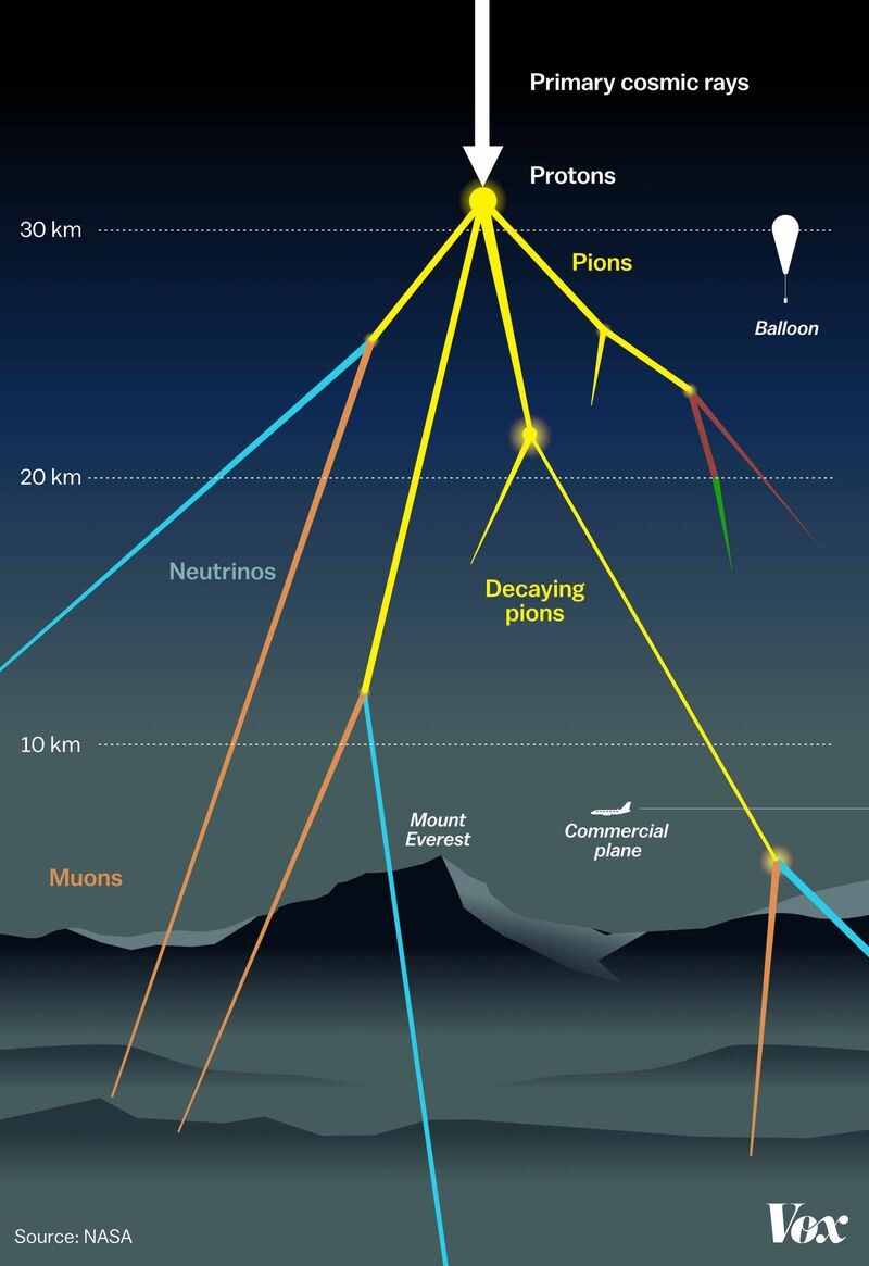 Радиация с большой проникающей способностью, движущаяся в космическом пространстве со скоростями близкими к скорости света называется космическими лучами. Некоторая часть космических лучей, проходя через Солнечную систему, доходит до поверхности Земли, в основном в виде частиц вторичного происхождения. Они возникают в результате взаимодействия космических лучей с ядрами атомов газов земной атмосферы. Вторичные лучи содержат электроны, позитроны, фотоны и другие частицы, тогда как первичные состоят из протонов и альфа-частиц (около 15%). Альфа-частицы представляют из себя ядра гелия. Интенсивность первичного комического излучения вблизи границы земной атмосферы в полярных широтах в 10 раз больше, чем на экваторе. Космические лучи являются важнейшим ионизатором атмосферного воздуха. Интенсивность космических лучей также зависит от солнечной активности. При внезапном выбросе плазмы из активных областей Солнца, в межпланетном пространстве образуются некоторые области, на границах которых н