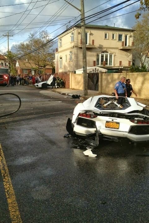 В пригороде Нью-Йорка произошло серьезное ДТП с участием дорогостоящего суперкара Lamborghini Aventador. Белоснежный Авентадор (стоимость в США около $400 тысяч) низко летел по своей полосе с приличной скоростью. Ничего не предвещало беды ровно до тех пор, пока водитель двигавшегося навстречу седана не решил свернуть в переулок через встречную полосу и не высунул капот авто на траекторию движения суперкара. Дальше — удар, после которого Ламбо отбрасывает на забор. ДТП было заснято с двух ракурсов на камеры рядом стоящего дома. В результате аварии Aventador развалился на две половины: задняя часть суперкара с двигателем и трансмиссией аккуратно отделилась от передней. По сведениям очевидцев, водитель Lamborghini в ДТП не пострадал.