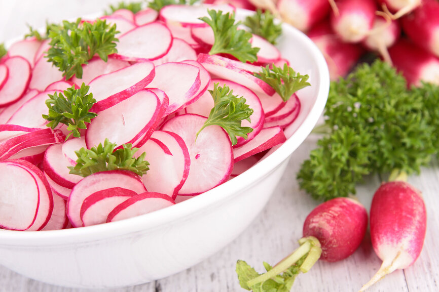 На 4 порции Редис - 4 пучка, лук зеленый - 1 пучок, зелень - 1 пучок, соль, перец, сметана, яйца по вкусу. Редис очистить, нарезать тонкими ломтиками, смешать с шинкованным зеленым луком и зеленью, заправить солью и перцем. Раннюю, молодую редиску можно не очищать. Салат заправить кислым молоком или сметаной. Можно добавить к салату рубленые яйца.