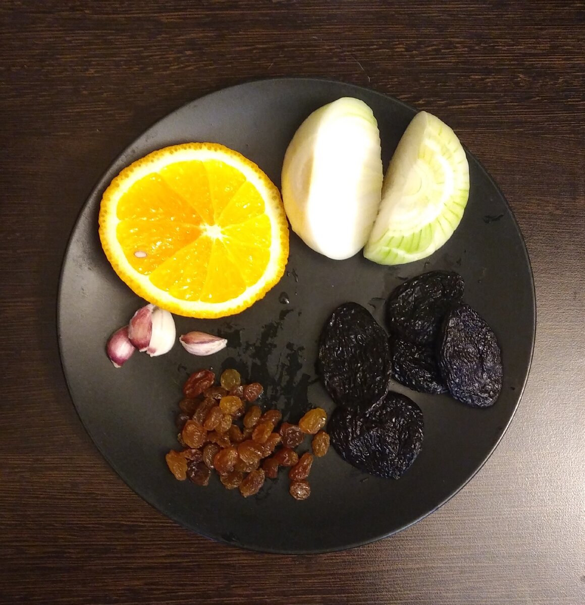 Апельсин можно отжать щипцами, остальное уже не нужно. Лука будет в любом случае в избытке - я мелко нарезал совсем чуть-чуть. А вот чеснока хотелось больше: при готовке он теряет всю свою остроту, становится сладким и ароматным. Чернослив можно разрезать на более мелкие кусочки, чтобы он не выбивался в гарнире.
