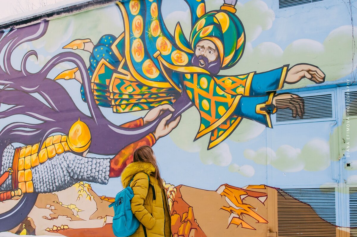 Наверняка пробегая по улице Жуковского, недалеко от Восстания, вы видели под аркой голову Черномора. Не постесняйтесь зайти во двор. Там вы увидите еще граффити на тему пушкинской поэмы Руслан и Людмила. Тут есть и кот ученый, леший бродит и ученая сова. Листайте галерею ниже