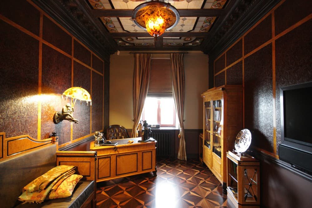 Особое место в эстетике ар-деко занимает кабинет. Это не просто место для работы. Это лицо хозяина. Кабинет призван подчеркнуть статусность своего владельца и его безупречный вкус. Обитатель такого кабинета — это топ-менеджер серьезной компании или владелец успешного бизнеса.
