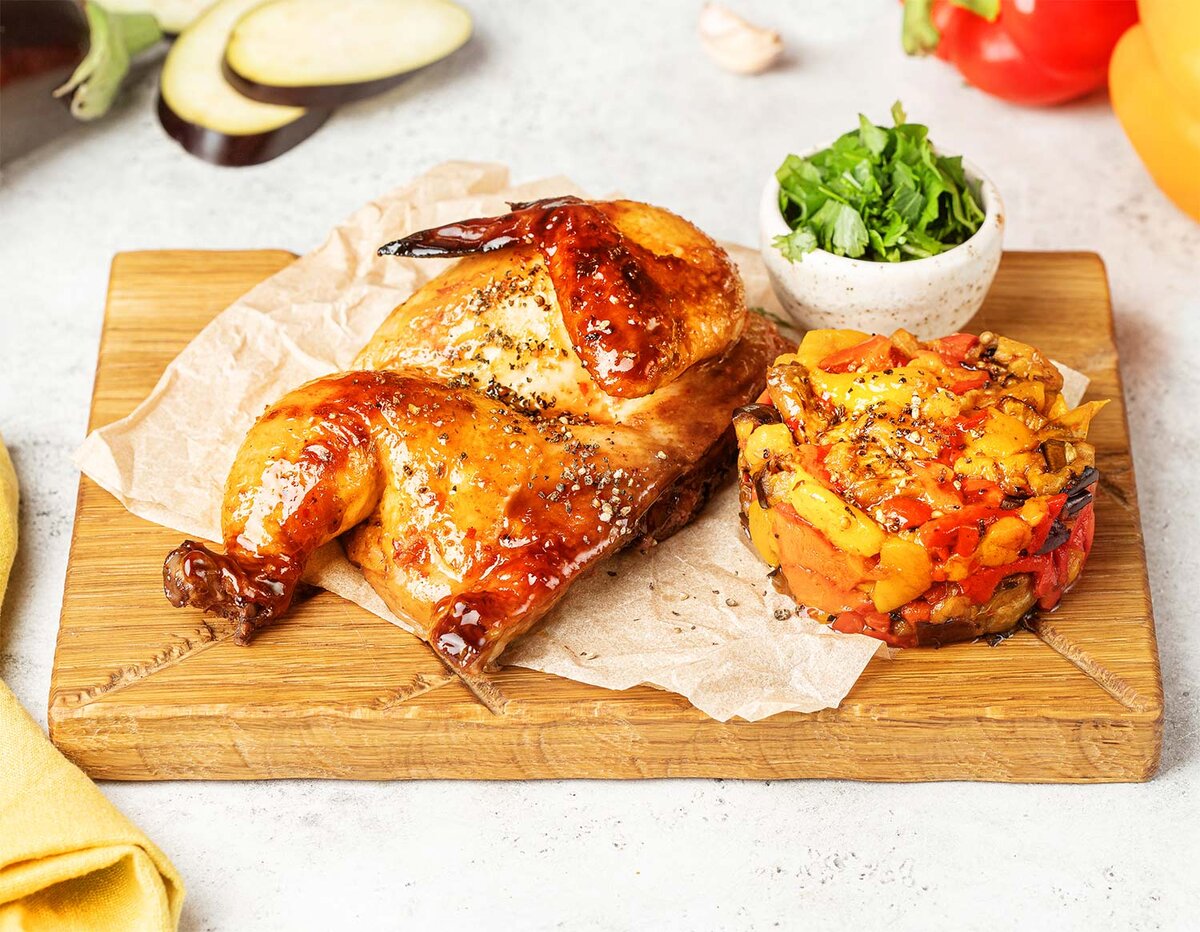 Когда 20 минут прошло, аккуратно достаем противень. Баклажаны гриль и перец гриль выкладываем рядом с цыпленком. Поливаем 1 ст. л. раст. масла и посыпаем по 0,25 ч. л. соли и перца. Отправляем в духовку еще на 10 минут⠀