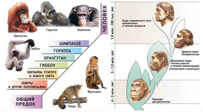 Человек и современные человекообразные обезьяны не только сходны между собой по своим морфологическим и физиологическим особенностям, но и находятся в близком родстве. Они являются двумя разными ветвями одного ствола, т.е. происходят от одного общего предка.