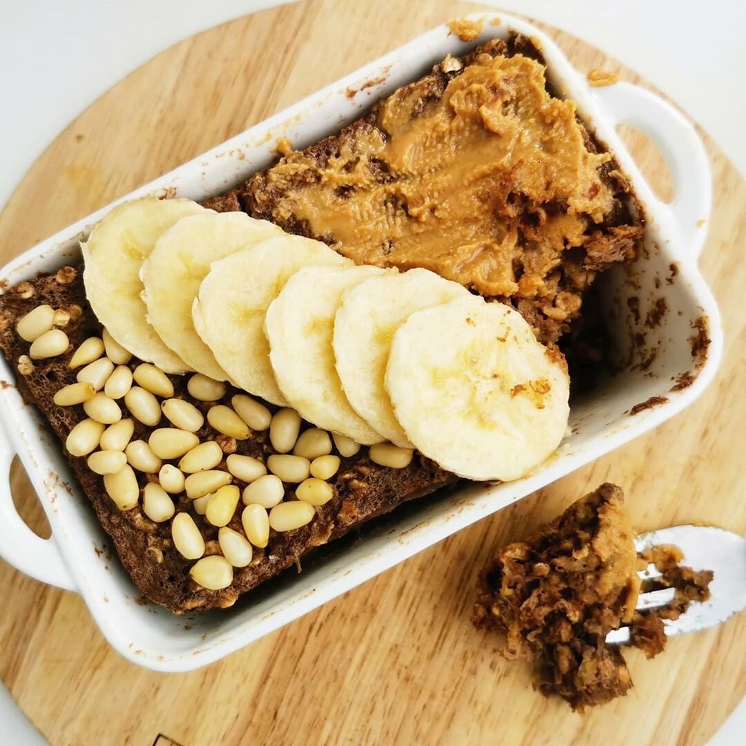 Банан размять вилкой и смешать все ингредиенты. Выливаем в форму и отправляем в микроволновку на 5 минут при 800w. Украшаем по желанию. У меня кедровые орешки, банан и арахисовая паста.