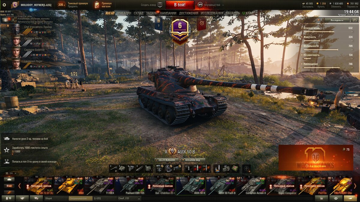 Всех любителей толстой брони и больших калибров категорически приветствую. Сегодня, я вам расскажу стоит ли качать AMX 50B. Погнали! Акция на AMX 50B будет, так как он выиграл в голосовании. Я думаю начнём с быстрого обсуждения ТТХ. Орудие у нас имеет барабан на 4 снаряда по 400 урона, суммарно 1600 урона. Перезарядка снарядов внутри барабана 2.5 секунды. Перезарядка барабана 27 секунд. Бронепробитие на ББ 257мм, БП 325мм. Этого с лихвой хватает, так как танк высокий и из-за этого приведённая броня становится меньше. А с НЛД противников вообще проблем не бывает. Итог по орудию: я считаю, что это один из лучших барабанов. При стрельбе из этого орудия, лично я не ощущаю того, что мне чего то не хватает. Броня у танка есть только в ВЛД. ВЛД реально бывает отбивает такие снаряды, которые даже настоящие тяжелые танки отразить, чаще всего не могут. Башня картон, борта и корма пробивается фугасами арты. Динамика у танка отличная. Уделка 19 и максималка 65 км/ч. С такими динамическими характ