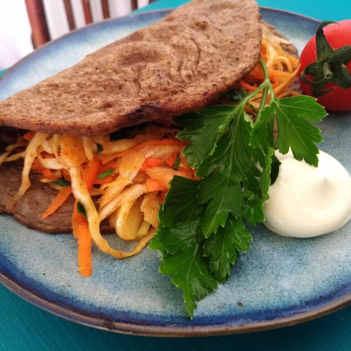 Для тех,кто на безуглеводной диете скучает по тортилья и прочим лепешкам отлично подойдёт этот рецепт.Овощи для начинки можно взять любые,свежие или тушёные.Можно ещё добавить чили,если вы его любите,сметану или кетчуп без сахара.Короче как всегда рецепт очень вариативный. Ингредиенты на 4 лепешки -400гр сырой куриной печени -2 яйца -2ст.л. безуглеводной муки(кокосовой,льяной) -Овощи для начинки-у меня капуста, морковь,зелень и редис -Заправка для овощей-по вашему вкусу.У меня заправка для корейской моркови. -Соль,масло для жарки Сначала приготовим тортильи.В чашу блендера положить сырую печень,яйца,соль, безуглеводную муку.Взбить все до однородности,оставить на 10 минут для набухания муки. На сковороде разогреть масло для жарки,вылить туда четверть приготовленной массы,разровнять и обжарить как обычные блины,с обеих сторон.Тоже самое проделать с остальным тестом.Готовые лепешки можно использовать по-разному-завернуть в нее овощи,добавить любые соусы.Можно сложить лепешки одну на другу