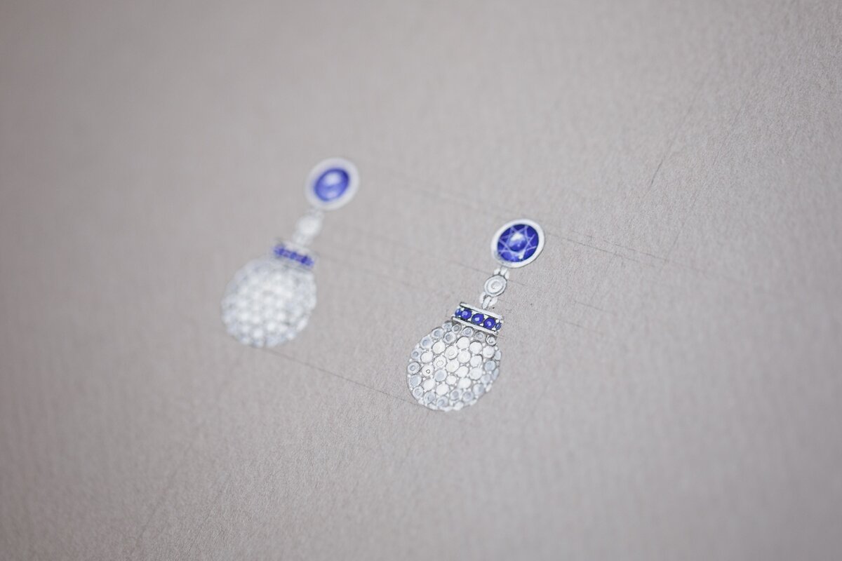 Сначала появляется идея, формирующая образ ювелирного украшения. Мы прорабатываем ее во всех подробностях вплоть до пробы золота и драгоценных камней, которые украсят новое изделие, и делимся информацией с отделом дизайна для создания технического рисунка. Художник переводит наши идеи в черно-белый рисунок, потом создает цветную модель, в которой каждый драгоценный камень соответствует своему цвету. Утвержденный эскиз переносится на компьютер и полностью дорабатывается для последующих технических работ.