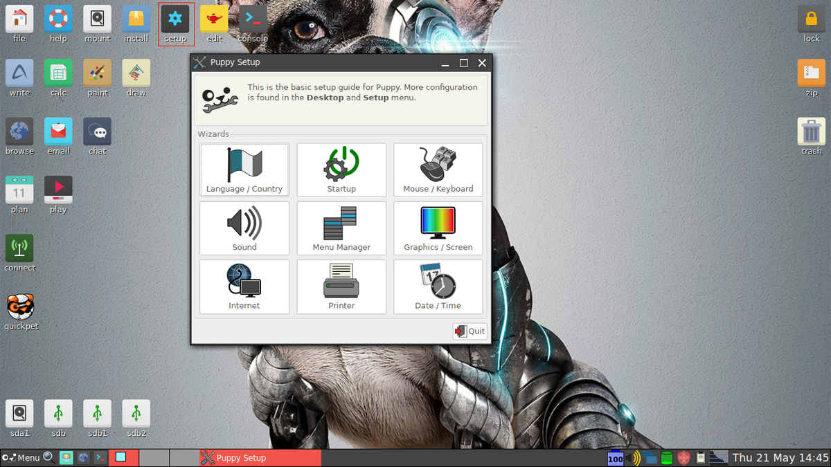 Размер образа дистрибутива Puppy Linux в версии bionicpup всего 354 Mb. Это очень лёгкая операционная система, но доступ к репозиториям Ubuntu даёт много возможностей для расширения. Перед записью iso-образа на USB-флешку, нужно отформатировать её файловую систему в ext3. Помимо загрузки в live-режиме, Puppy может полностью выгружаться с флешки в оперативную память вашего ПК (режим RAM only в меню выбора загрузки), и работать только оттуда. Т. е. после такой загрузки флешку можно извлечь. Конечно, данные и настройки сохранить не получится, но из оперативки ОС работает очень быстро. Из практического применения такого режима представляется простой серфинг в сети, или сохранение файлов в облако. Основные настройки системы доступны в утилите Setup на рабочем столе: Интернет Для подключения к Интернету в Puppy Linux переходим в Install > Internet > Wired or wireless LAN Далее выбираем пункт Frisbee Система определит сетевые устройства автоматически. Установка Puppy Linux Чтобы установить