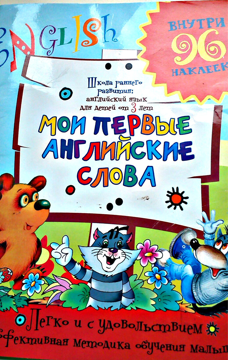 Слова "легко", " с удовольствием" , "эффективная методика" должны сподвигнуть родителей на покупку этой книги. Не знаю, откуда она взялась у наших родственников. Дети сказали "подарили". Ну что, неплохая обложка с Винни - Пухом, Матроскиным и волком из "Ну, погоди!". Лучше, чем если бы были на обложке тролли. Выпущена в Москве. Тоже неплохо. 96 наклеек ? Прекрасно! Навряд ли дети сразу запомнят слова. Но пальчиками поработают. Некоторые родители подумают, что вот прямо от трех лет можно по этой книге начинать заниматься! Да-да! В три года ребенок может сжевать наклейки. Вот поэтому от трех лет. Я же еще внутрь не заглянула! Тадам! Вот вам и доказательство ! Составь слова! То есть ребенок должен уже уметь читать! В каком- каком классе они там начинают читать по- английски в школе? И эта картинка справа- что за прелесть! Предлагаю взрослым написать слово , которое оканчивается на " in ", глянув на эту такую нужную ребенку от трех лет картинку! Позор всем тем, кто учил английс