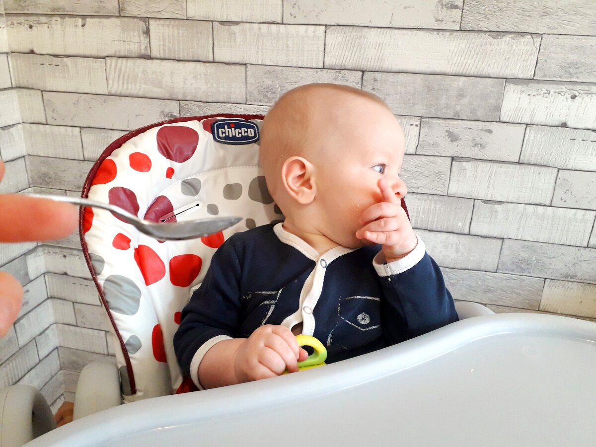 Помню начало прикорма с первым сыном. На трон (то есть столик для кормления) был посажен Миша, ему надели слюнявчик и всунули ложечку первого пюре. Мама выполнила главную задачу для 6 месяцев - ввела новую пищу!))