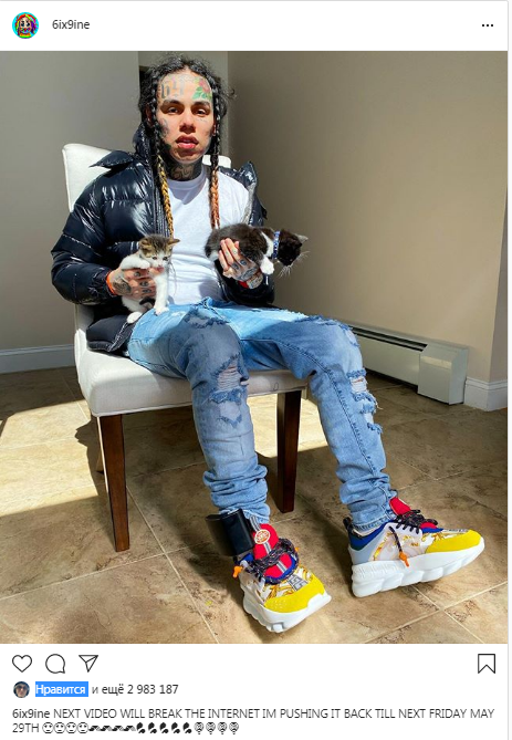 6ix9ine перенёс дату релиза нового трека на 29 мая * СЛЕДУЮЩЕЕ ВИДЕО СЛОМАЕТ ИНТЕРНЕТ Я ОТОДВИГАЮ ЕГО НАЗАД ДО СЛЕДУЮЩЕЙ ПЯТНИЦЫ 29 МАЯ Напомню, про его последнюю работу "GOOBA" , которая набрала 207кк просмотров и 6кк лайков за 2 недели. Он отметил, что новый клип взорвёт интернет !
