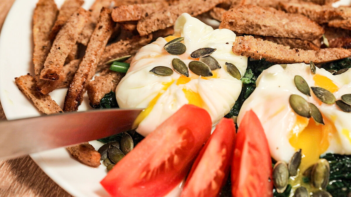 Яйцо Пашот. Как приготовить Яйцо Пашот. Шпинат, сухарики и тыквенные семечки.