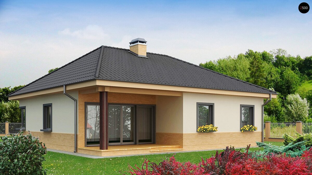 Z24 — это практичный одноэтажный дом с многоскатной кровлей. Его простую форму разнообразят углубленный вход и крытая терраса, а угловое окно в кухне выделяет его среди многих других проектов. Преимущества проекта Z24: Понравился проект? Пишите комментарии. Посмотреть другие проекты вы можете на сайте.