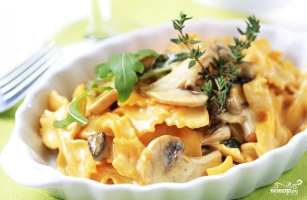 Если ты не успел приготовить себе обед, а времени до конца перерыва совсем немного, тогда этот рецепт для тебя!) Ингредиенты: Паста — 400 Грамм (выбирайте пасту из твердых сортов пшеницы) Шампиньоны — 600 Грамм Сливки — 200 Миллилитров Мука — 1 Ст. ложка Сыр Пармезан — 30 Грамм Соль — 2 Щепотки Черный перец — 1 Щепотка Количество порций: 4-5 Подготовьте необходимые ингредиенты, помойте шампиньоны. Пасту (любой формы) опустите в кипящую подсоленную воду и варите на 1 минуту меньше, чем указано на упаковке. Тогда внутри сохранится твердый центр, а паста не потеряет полезные качества. Пармезан натрите на мелкой терке. Помытые шампиньоны порежьте тонкими пластинками. Порезанные грибы переложите в сковороду, закройте крышкой и жарьте на среднем огне до появления жидкости. После этого добавьте в сковороду муку, сливки, соль и перец. Готовьте соус под закрытой крышкой в течение 10-15 минут. Готовую пасту разложите по тарелкам, сверху выложите соус, присыпьте тертым