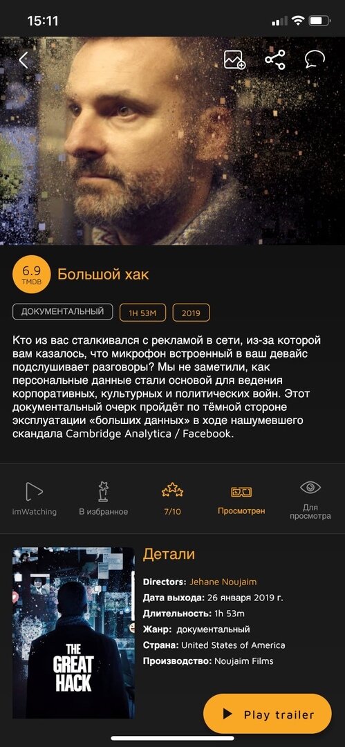 * рейтинг Кинопоиск - еще нет, так как новый фильм, но рейтинг кинокритиков 85%. * Жанр: документальный * Прошлогодний скандал с утечкой персональных данных 87 млн. пользователей Facebook и их использованием компанией Cambridge Analytica для влияния на мнение избирателей Великобритании и США привел не только к рекордным для IT-индустриям штрафам, но и к осознанию того, что все мы уже оцифрованы, взвешены и измерены, и на основе собранных соцсетями данных подвержены стороннему влиянию. Не защищен никто. Документальный фильм The Great Hack, вышедший на Netflix, рассказывает о скандале Cambridge Analytica с точки зрения нескольких человек, непосредственно участвовавших в событиях. Это не выдуманный киберпанк из компьютерной игры или фантастического романа – это уже реальность. И об этом нужно говорить как можно чаще, требовать от законодателей принятия инициатив, защищающих персональные данные. И с этой точки зрения The Great Hack делает важную работу. Если хотя бы часть пользователей N