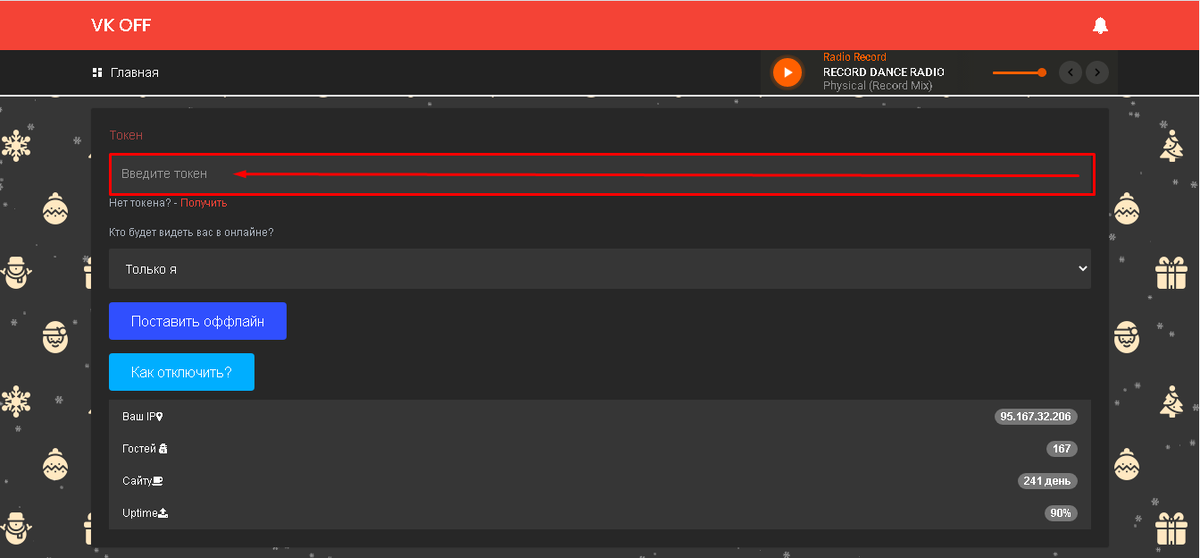 ДЛЯ ДАННОГО СПОСОБА ВАМ ПОДОЙДЁТ ЛЮБОЕ УСТРОЙСТВО. БУДЬ ТО ТЕЛЕФОН, ПК, ИЛИ ПЛАНШЕТ, НЕ ВАЖНО. 1. ПЕРЕХОДИМ НА ЭТОТ САЙТ: VK OFF 2. ВИДИМ ПОЛЕ ДЛЯ ВВОДА ТОКЕНА: 3. ПОЛУЧАЕМ ТОКЕН, ВСЁ БЕЗОПАСНО, ТАК КАК ЭТО ОФФИЦИАЛЬНЫЙ ВХОД В ВК! 4. НАЖИМАЕМ "РАЗРЕШИТЬ" 5. И КОПИРУЕМ НАШ ТОКЕН ДО ЗНАКА & (АППОСТРАФ) 6. ВОЗВРАЩАЕМСЯ ОБРАТНО НА НАШ САЙТ, И ВСТАВЛЯЕМ ТОКЕН В ПОЛЕ ДЛЯ ВВОДА И НАЖИМАЕМ КНОПКУ "ПОСТАВИТЬ ОФФЛАЙН" ДЛЯ КОГО БЫЛА ПОЛЕЗНАЯ ФИШКА, ПОДПИСЫВАЙТЕСЬ, ВПЕРЕДИ БУДУТ ЕЩЁ ПРИКОЛЫ :)