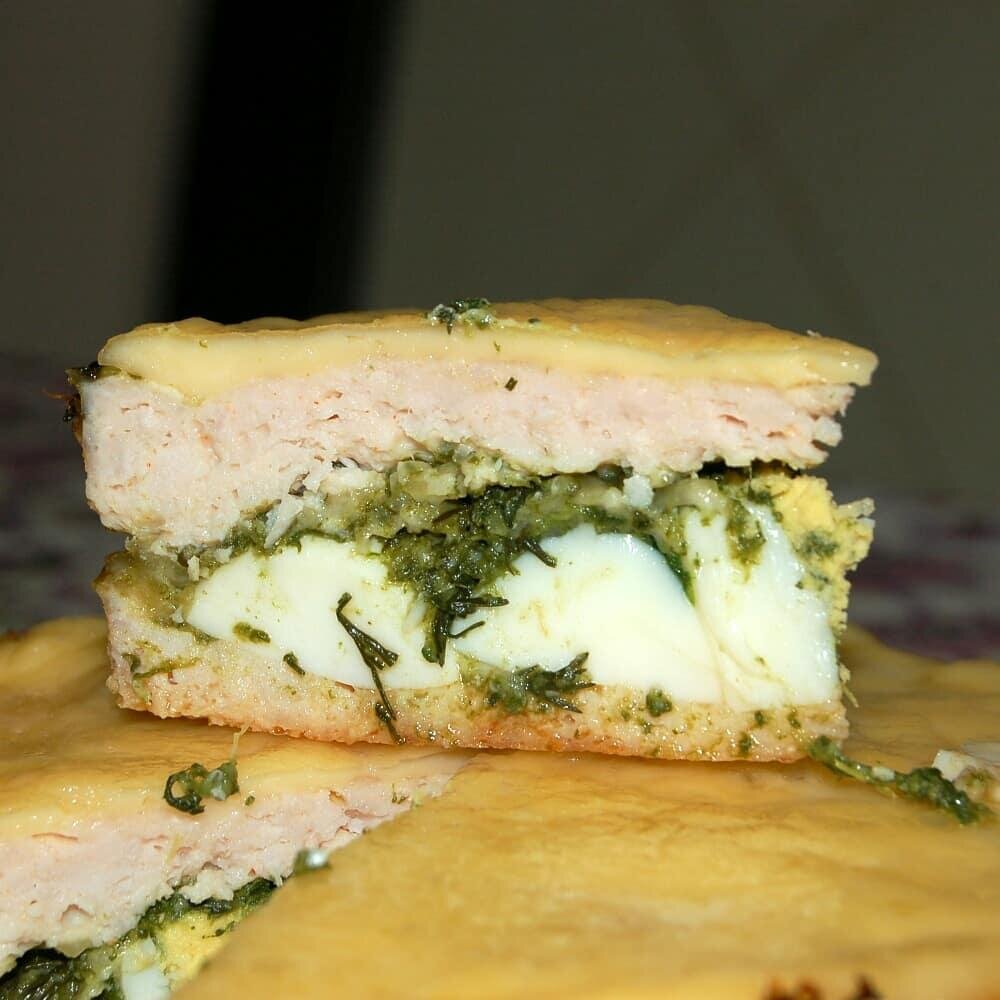 Очень вкусный и нежный куриный пирог, прекрасно подойдёт к любому гарниру!! И отличная замена колбасы для бутербродов. На 100 грамм 116,51 калорий, Б/Ж/У 15,92/4,64/1,68 Нам потребуется: Приготовление: 1. Предварительно сварить 2 яйца. Порезать их кружочками. 2. Филе грудки и лук прокрутить в мясорубке. Посолить, поперчить, добавить любимые специи и 1 яйцо. 3. Поделить наш фарш на две части. Одну выложить в противень, а сверху положить яйца, шпинат и половину сыра, который предварительно натереть на крупной терке или порезать тонкими пластинами. Сверху закрыть оставшимся фаршем. 4. Выпекать в духовке при температуре 200-220 градусов около 35 минут. Вытащить наш пирог и посыпать сыром, поставить в духовку еще на 10 минут. Я выпекаю в силиконовой форме, смазывать ее не нужно. Если у вас другая форма, то ее нужно смазать сливочным маслом, чтобы наш пирог не подгорел. Все! Быстро, просто, вкусно! Как я люблю. На все приготовление потрачено 15 минут, остальное дело духовки. Интересный