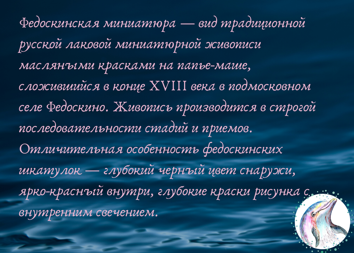 Сегодня я хочу рассказать о человеке невероятного таланта – потомственной художнице Надежде Стрелкиной. Но прежде, чем мы начнем, советую воспроизвести композицию, которую написал корейский пианист и композитор Yiruma. Мне кажется, эта музыка в наибольшей степени соответствует стилю, манере и изображаемым образам художницы. Итак, как я уже сказала, Надежда – потомственная художница. Родилась и выросла она в деревне Федоскино под Москвой. К приобретению федоскинской миниатюрой мировой славы приложили руки предки художницы. На рубеже 19-20 веков прадедушка Надежды Захар Тимофеевич владел «Бурбышевской мастерской», в которой изготавливались лаковые расписные табакерки и другие изделия. После революции мастерская была вынуждена прекратить своё существование. Династию продолжили Семён и Дмитрий Захаровичи, работая художниками в Федоскинской артели в советский период. А дальше уже Виктор Семёнович, отец Надежды, продолжил семейное дело, проработав на Федоскинской фабрике миниатюрной жив