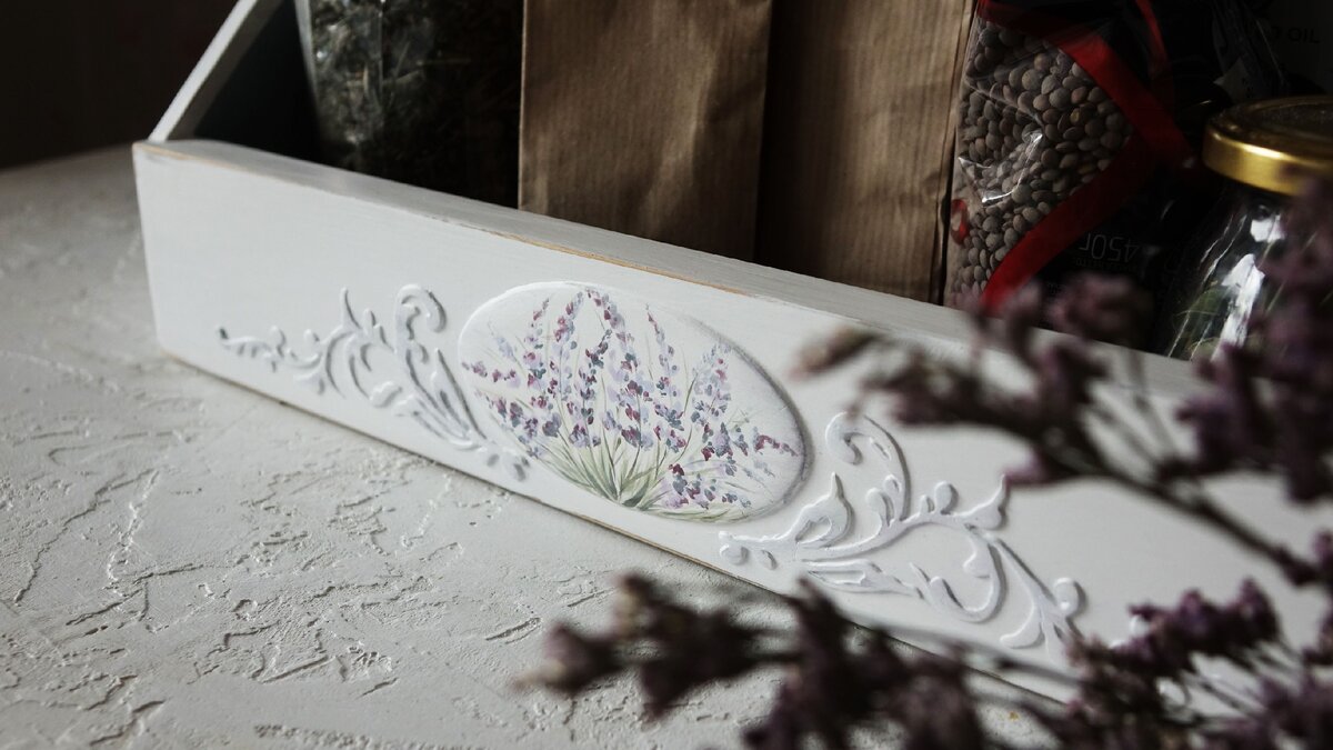 Ненужные части от старой мебели можно превратить в функциональные украшение интерьера! Немного фантазии и.. немного любимых красок) В новом мастер-классе Наташа Удовина поделится идеей превращения ящика от комода в короб для специй в стиле прованс, раскроет секрет создания рельефных узоров и покажет как рисовать лаванду. Материалы, использованные в работе: • грунт Левкас • Белая акриловая краска • акриловые краски «Акрил-Хобби Де Люкс» (вереск, исландский мох, прованская лаванда, английская сирень, фисташковый, хаки) • рельефная паста тонкая • акриловый матовый лак • синтетические кисти • наждачная бумага, пустая пластиковая туба. Скачать отсканированный эскиз узоров: https://yadi.sk/i/DQ4f9Nlh26LqBQ
