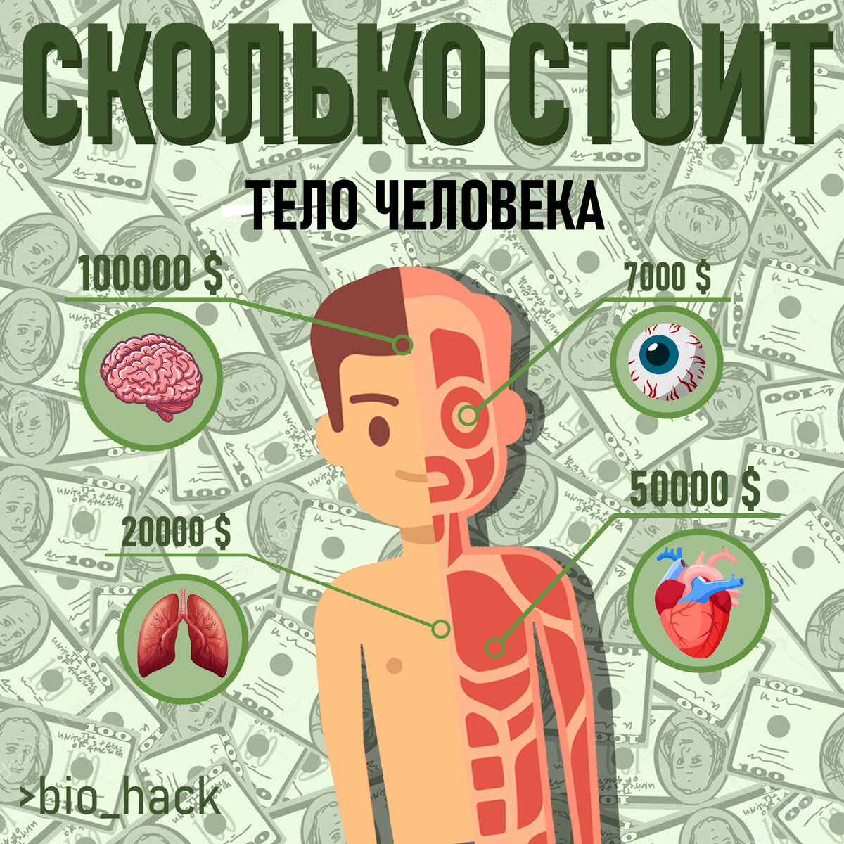 Сколько стоит тело человека? Органы человека - высоколиквидный товар. Люди, которые нуждаются в трансплантации часто не могут дождаться своей очереди и вынуждены искать доноров на черном рынке. Цены на органы очень зависят от страны, тем более - во многих странах органы продаются только на черном рынке. органы умершего человека стоят в 2 раза дешевле. Почка: 30-70 тыс. $ Печень: 120 тыс.$ за целую и 60 тыс. $ за часть. (печень восстанавливается) Кожа: 10$ за квадратный дюйм (6.5 кв. см) Легкие: 150 тыс. $ за 2 штуки Сердце: 250 тыс $ Роговица: 5 тыс. $ Поджелудочная железа: 70 тыс. $ Тонкая кишка: 2.5 тыс. $ Селезёнка: 500 $ Желудок: 600 $ Коронарная артерия: 1.6 тыс. $ Желчный пузырь: 1.2 тыс. $ Половые железы: до 15 тыс. $ Коленный сустав: 6 тыс. $ Рука с предплечьем: 400 $ Череп с зубами: 1.2 тыс. $ Донорство - это безопасный вариант заработать на своем теле, т.к. эти биоматериалы восстанавливаются. Волосы: Длина волос не менее 50 см. Больше всего ценятся неокрашен