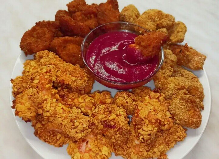 Ингредиенты: Способ приготовления: Мякоть курицы нарезаем на не большие, но желательно одного размера кусочки. Маринуем в соевом соусе, 2 часов хватит (если не любите соевый соус, просто посолите, тогда мариновать не нужно). В отдельной миске взбиваем яйца и выкладываем в нее уже замаринованные кусочки курицы (если не мариновали в соевом соусе, добавьте соль). Кукурузные хлопья измельчить в блендере (ступке или любым удобным способом), главное не в пыль. Выуживаем наши кусочки из взбитого яйца и хорошенько обваливаем в получившейся панировке. Выкладываем запанированные кусочки на застеленный пергаментом противень и ставим в заранее разогретую до 200 градусов духовку на 25 мин. Этого времени хватит для приготовления золотистых, хрустящих куриных наггетсов. Подаем на стол со сметаной и овощами или любым гарниром. ПРИЯТНОГО АППЕТИТА!!!!