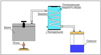 Все большую популярность, у желающих приобрести оборудование для приготовления домашнего алкоголя, в последнее время завоевывают аппараты колонного типа. Это правильный выбор так, как на этом оборудовании можно получить алкоголь высокой очистки и хорошей спиртуозности. Однако чтобы получить классный алкоголь на таком оборудовании, конечно нужно предварительно ознакомиться с правилами и технологией процессов получения алкоголя, потому, что работа этих аппаратов очень отличается от аппаратов работающих по принципу дистилляции. Многим этот процесс знаком- нагрел жидкость ( брагу) до кипения получил пар, его охладил, получил спиртуозную жидкость, которая называется спирт-сырец или просто первач. Это не очищенный от сивух алкоголь, обычно со спируозностью до 55%. Схематично этот процесс выглядит так: На таком самогонном аппарате, который работает по принципу прямой дистилляции, трудно провести качественную очистку алкоголя, то есть удалить из спирта-сырца отравляющие компоненты.