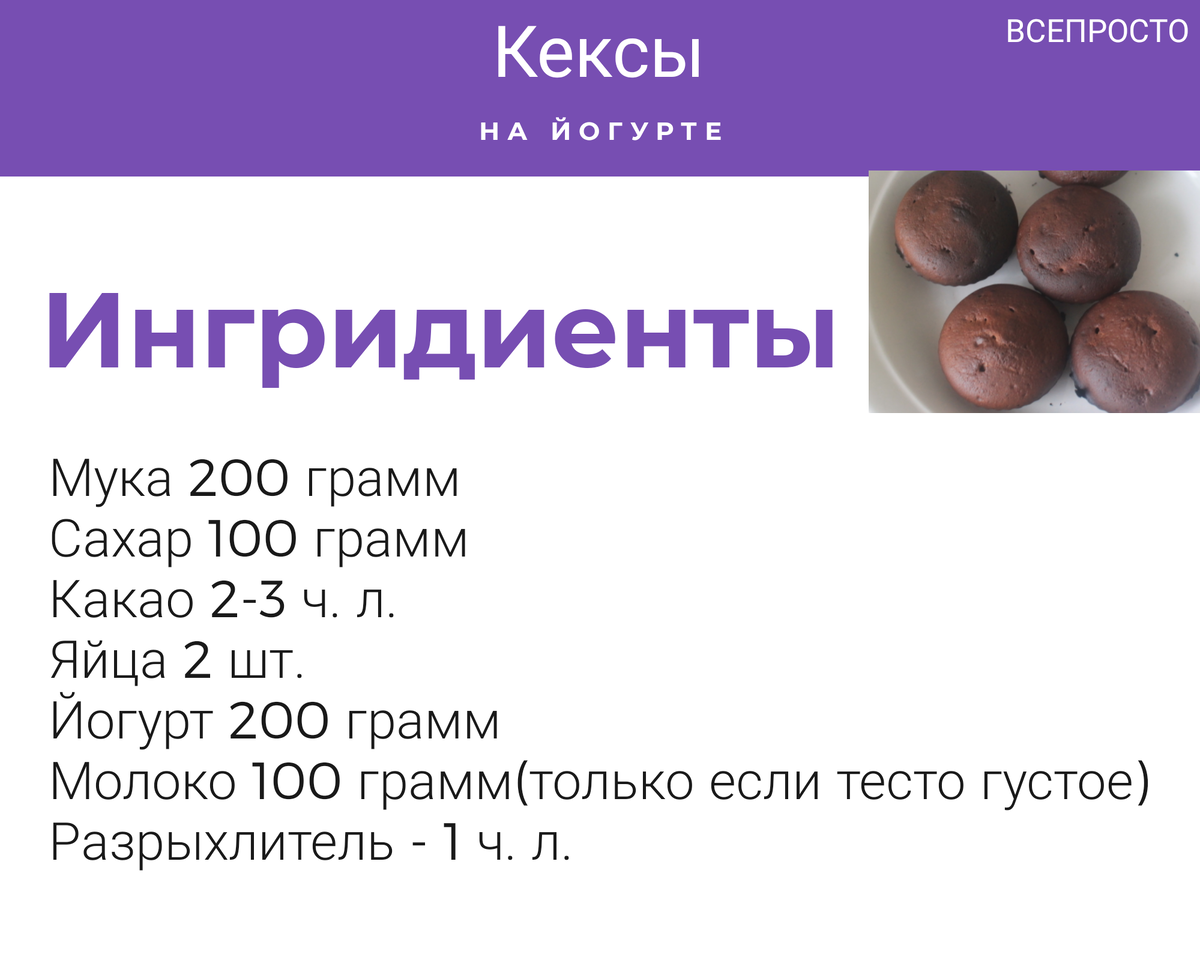 Ингредиенты : Мука 200 грамм Сахар 100 грамм Какао 2-3 ч. л. Яйца 2 шт. Йогурт 200 грамм Молоко 100 грамм(только если тесто густое) Разрыхлитель - 1 ч. л. Отделяем желтки от белков. Взбиваем белки, постепенно добавляя сахар, до густого и вязкого состояния. Перемешиваем желтки до однородности. Аккуратно добавляем в белки 200-250 г. муки и взбитые ранее, яичные желтки. Полученную массу немного перемешиваем и добавляем йогурт 200 г, если получается очень густое тесто, можно добавить 100 мл молока. Все тщательно перемешиваем, добавляем Разрыхлитель 1 ч. л. и 2-3 ч. л. какао. Тщательно перемешиваем тесто, чтобы какао полностью растворилось. Разливаем по формочкам, которые лучше предварительно смазать небольшим количеством растительного масла Ставим в разогретую духовку на 20-30 минут. Если выпекаете в газовой духовке, то на медленном огне и лучше всего поднять противень как можно выше. Готовность кексов можно проверить при помощи обычной зубочистки. Приятного аппетита!!! Пригла