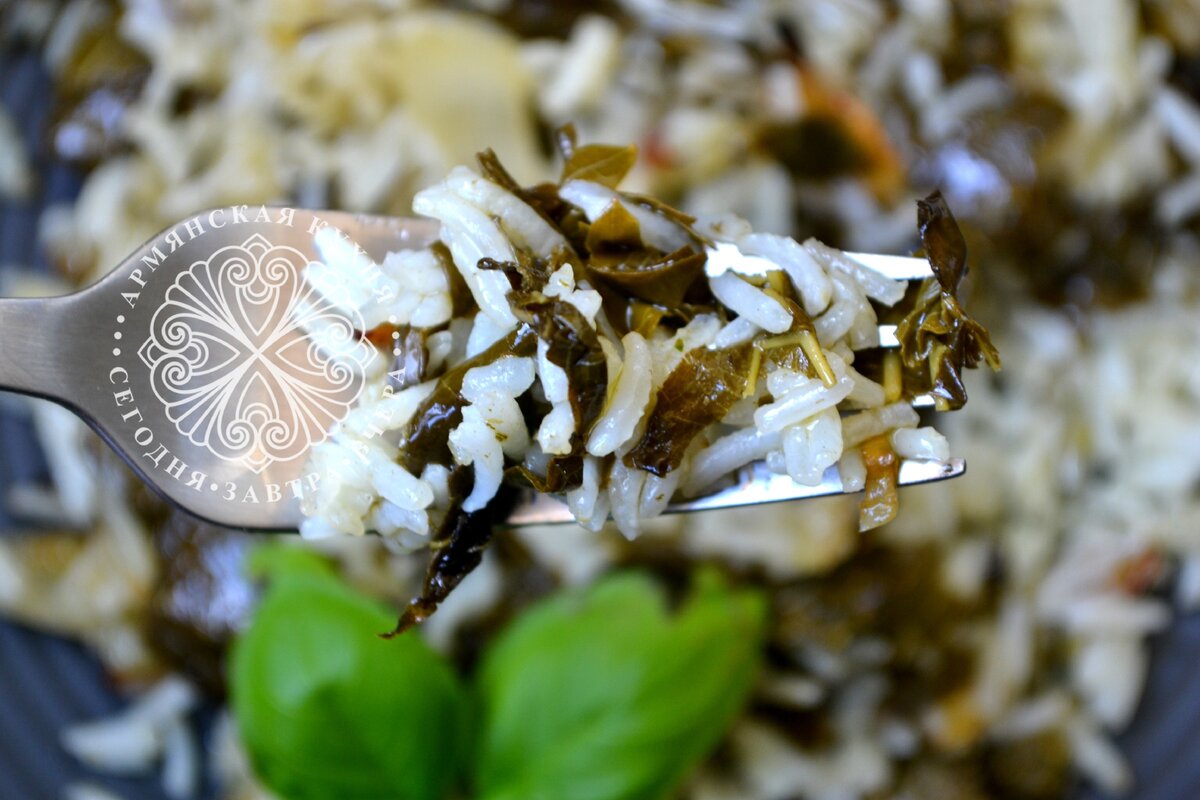 Не знаю, сказали ли что-нибудь про виноградные листья британские ученые, которые, как известно, эксперты по всем вопросам (шутка), но зато наши прапрапрабабушки давным-давно оценили пользу этих листиков. Ну, во-первых, толма, самая настоящая и самая вкусная толма только в виноградных листьях. Вот написала и задумалась, а разве может быть невкусная толма? Как считаете? Так вот, пока листья свежие, толму крутят из свежих листьев, а заодно и на зиму заготавливают. Ну а если толму лень крутить или просто некогда, то можно сделать плов на скорую руку) Не простой плов, а очень полезный. Ведь листики винограда богаты витаминами А, С, В, марганцем, магнием, железом и кальцием. Употребление в пищу виноградных листьев поможет людям, которые страдают от отеков и венозной недостаточности. Не буду цитировать весь интернет, а перейду к рецепту.Плов с виноградными листьями готовят в конце весны- начале лета, пока листочки нежные. Очень простой и легкий рецепт.Виноградные листья хорошо промыть, отрезать хвостики, оставить в очень горячей воде минут на 5-10, затем промыть холодной водой, откинуть на дуршлаг, чтоб стекла лишняя вода, мелко нарезать. Рис перебрать промыть пару раз под проточной водой, пока она не станет прозрачной. Воду слить. На разогретом масле обжарить мелко нарезанный лук до прозрачности, добавить нарезанные листья, перемешать, потушить пару минут. Добавить рис, обжарить пару минут с листьями,добавить воду, приправить солью и перцем. Как только закипит, убавить огонь варить на умеренном огне под крышкой. Когда рис будет практически готов, добавить зелень. Нам понадобится:
