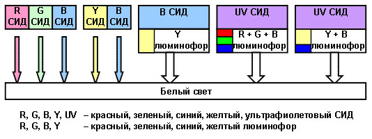 • Ультрафиолетовый СИД + синий, зеленый и красный люминофор