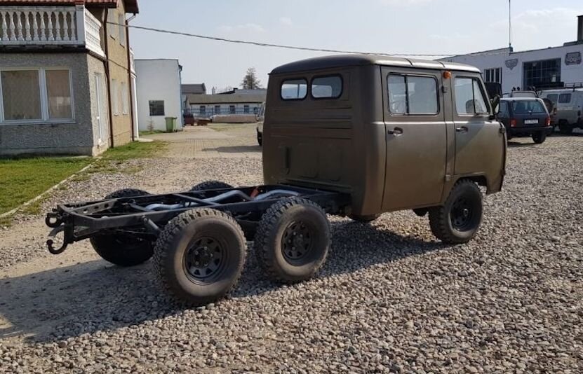 УАЗ- «Буханка», как известно из многочисленны мемов, машина которая сразу получилась идеальной, поэтому за многие десятилетия производства она почти не изменилась, ни внешне, ни технически. Вот только третьей оси у серийных УАЗов никогда не було, хоть попытки внедрить её и велись, но сейчас не о них. Изначально это был обычный УАЗ-3909, приобретенный немцем, любителем домов на колёсах. Стандартной длины и проходимости владельцу показалось мало и он решил немного удлинить «Буханку», добавив заодно и недостающий третий мост. Воплощать проект взялись мастера одного из польских тюнинг-ателье. Машину полностью разобрали. Раму удлинили, кузов наоборот - укоротили. Получилась пятиместная дубль – кабина. Задняя стенка кабины , кажется, вообще от «головастика», но могу и ошибаться. Подвеску изначально тоже хотели поменять, на пневматическую, но передумали и оставили штатные рессоры. Третья ось – обычный задний уазовский мост, привод которого идет отдельным карданным валом. Такая конструкция по