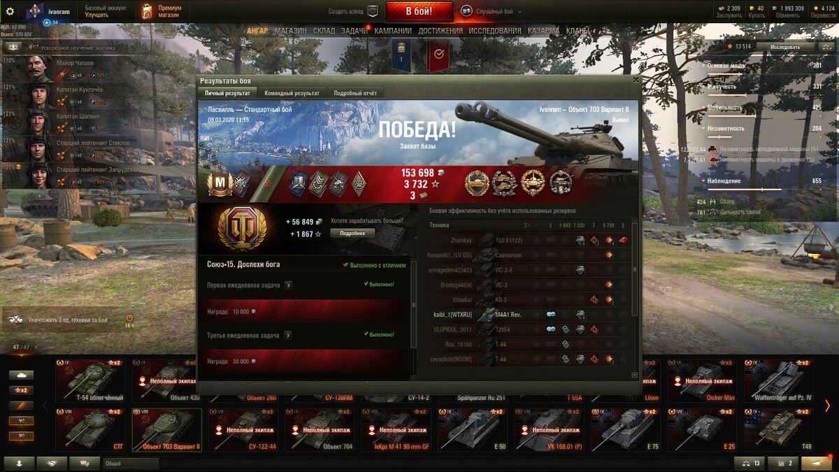 Здравствуйте.Хочу поговорить про советскую двухстволку об.703-2.Этот танк я получил с коробок на новый год(потратил где-то 1500руб)но я считаю за эти деньги норм.Вообщем я был очень рад.Но сначала было сложно приспособится к механике выстрела.Короче поменял выстрел залпом на Q ,а то изначально было кнопкой мышки.Вообщем получается играешь как на итальянцах с дозаряжанием.Но можно и залпом дать,но это когда полностью уверен в попадании.Орудие довольно хорошее,пробитие 225мм голдой 270мм,свидение 3.2сек,но это не много так как стабилизация хорошая.Броня приличная но с 10-ками поосторожнее надо.Если в топе уверенно можно агрессивную тактику применять.Единственный минус УВН -5.На прокачиваемом ис-2 они лутше.Но как мы знаем это было бы слишком хорошо, WG так не могут.Оборудование не совсем стандартное:вентиль,стабилизатор иииии просветленка так как улучшение обзора важно.Обзор на нём никакой а при перках и оборудовании 420м это хорошо.Танк довольно редкий в игре так что я доволен что он у
